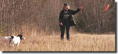 She is also trained on marked retrieves in a great variety of ways. The classical "around the clock" (one dummy at 9 a clock, one at 12 a clock and one at 3 a clock) she handles very well. We have also started to put in some disturbance during the work, like throwing another dummy on her way back or firing a gun.