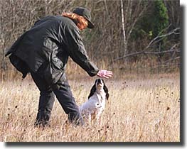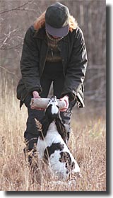 The basics in the fine art of retrieving are constantly maintained. She must hold the dummy until told to "give". Our hands must not be the signal for her to give but only our verbal command. We demand her to hold the dummy even when we pull it with our hands or disturb her in other ways. This is important since the dummy will sooner or later be a wing shot bird, a runner, and should she spit such a bird out before given permission we could be in trouble getting the bird into the game bag.